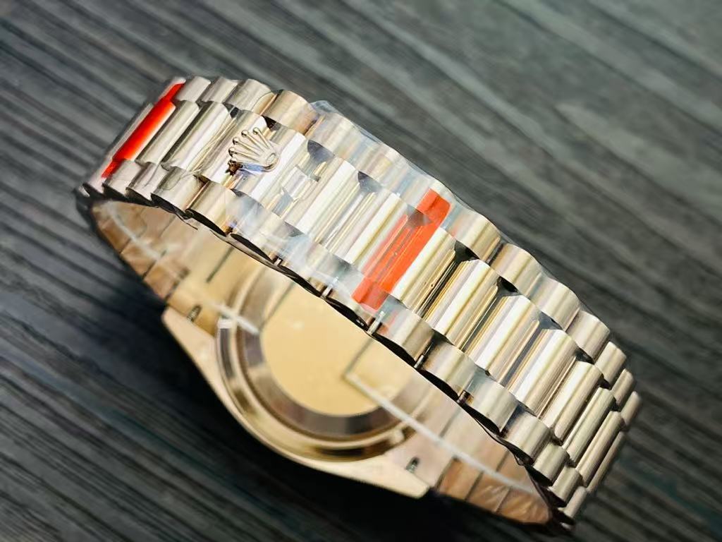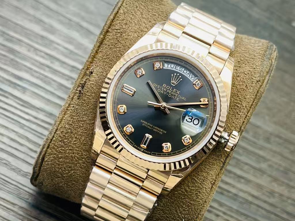 Make a bold statement of success and sophistication with this exquisite luxury watch inspired by the iconic Rolex Day-Date. Crafted entirely in gleaming gold, this timepiece radiates elegance and authority. The deep black dial features sparkling diamond hour markers that catch the light beautifully, creating a striking contrast that commands attention.