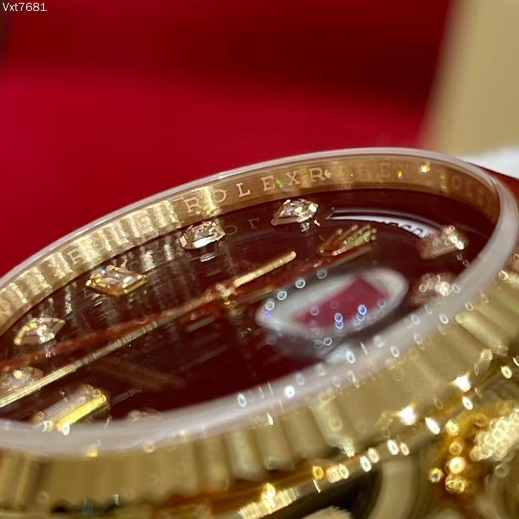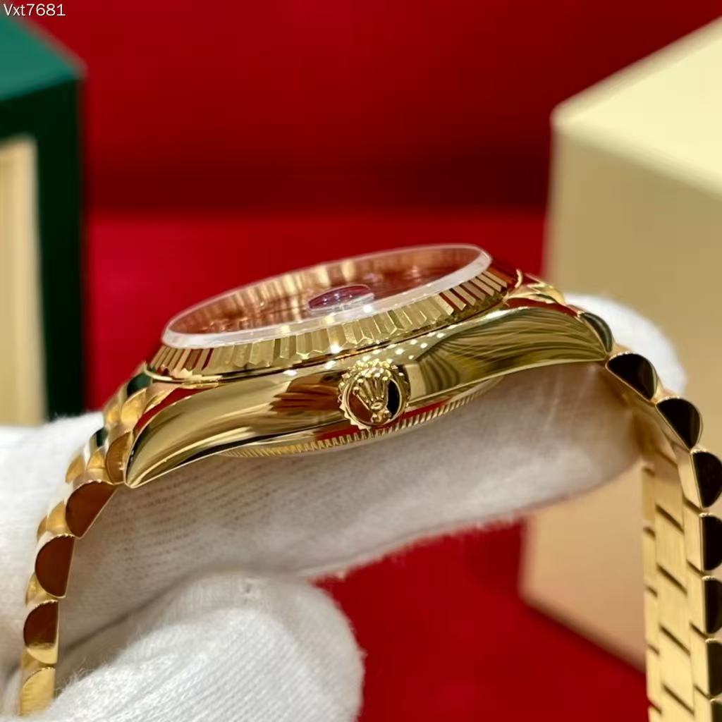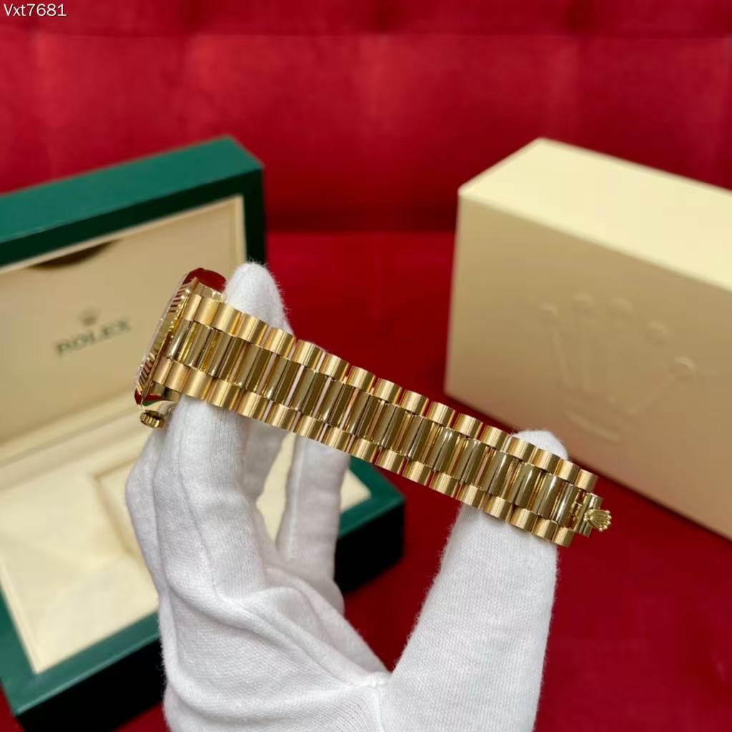Housed in a fully polished gold-tone case with a matching Oyster bracelet, it offers a seamless, luxurious silhouette that exudes confidence and authority. The fluted bezel enhances its classic charm, making it perfect for formal events, business meetings, or high-profile occasions.