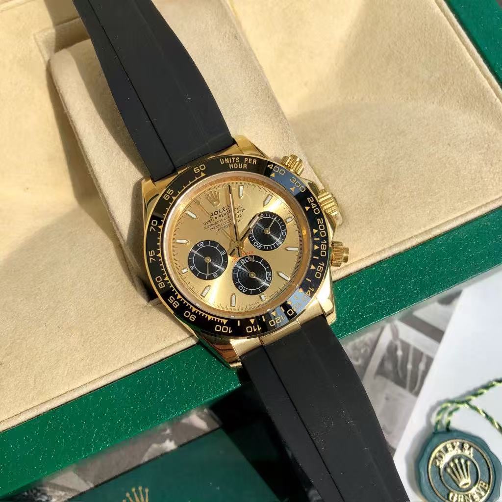 Paired with a durable black rubber strap, it offers both comfort and flexibility — ideal for active lifestyles or formal events. The screw-down crown enhances water resistance, ensuring reliability in various conditions. Every detail — from the engraved “ROLEX” logo to the “Superlative Chronometer Officially Certified” text — reflects precision engineering and refined craftsmanship.
