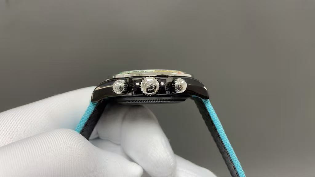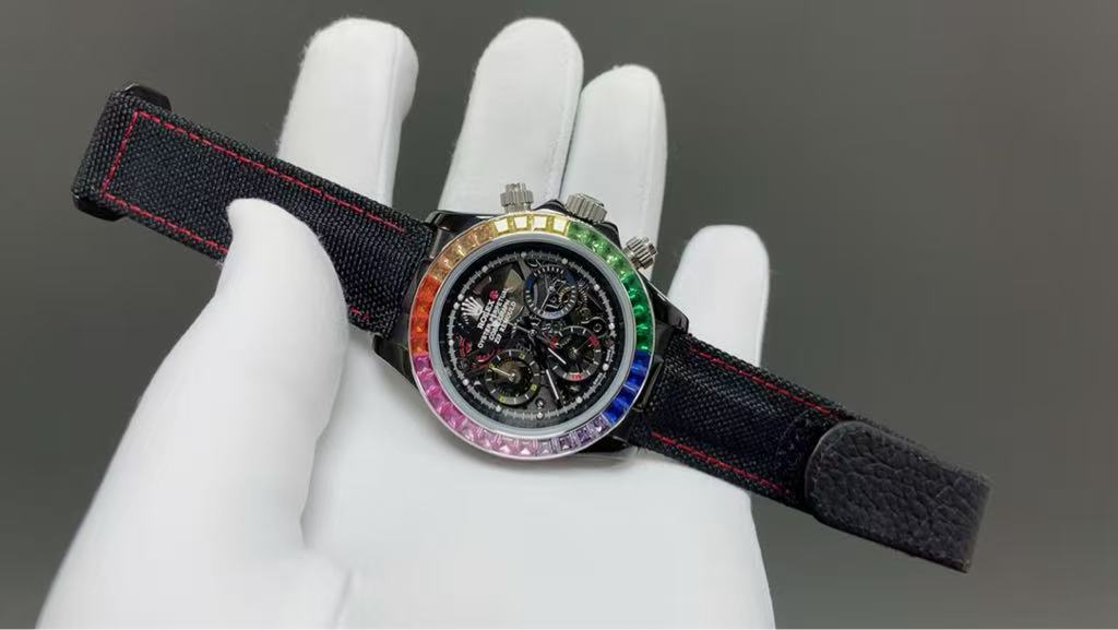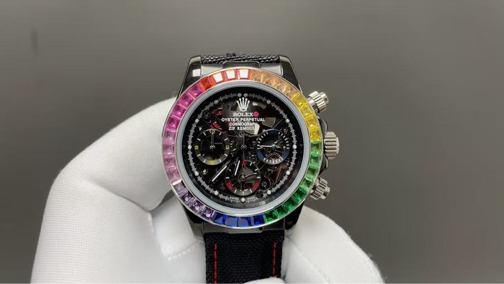 Make a bold statement of opulence and style with this extraordinary luxury chronograph watch inspired by the iconic Rolex Cosmograph Daytona. Featuring a stunning rainbow gemstone bezel adorned with multi-colored stones — including red, orange, yellow, green, blue, and purple — this timepiece radiates brilliance and sophistication. Each stone is meticulously set to create a mesmerizing spectrum that catches the light from every angle, making it a true masterpiece of craftsmanship.
