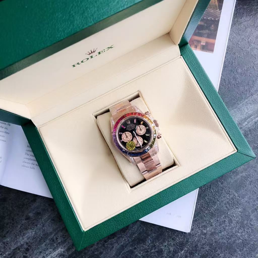 Make a bold statement of opulence and style with this extraordinary luxury chronograph watch inspired by the iconic Rolex Cosmograph Daytona. Featuring a stunning rainbow gemstone bezel adorned with multi-colored stones — including red, orange, yellow, green, blue, and purple — this timepiece radiates brilliance and sophistication. Each stone is meticulously set to create a mesmerizing spectrum that catches the light from every angle, making it a true masterpiece of craftsmanship.