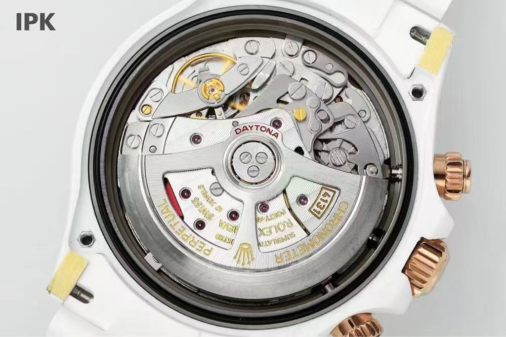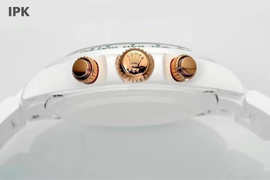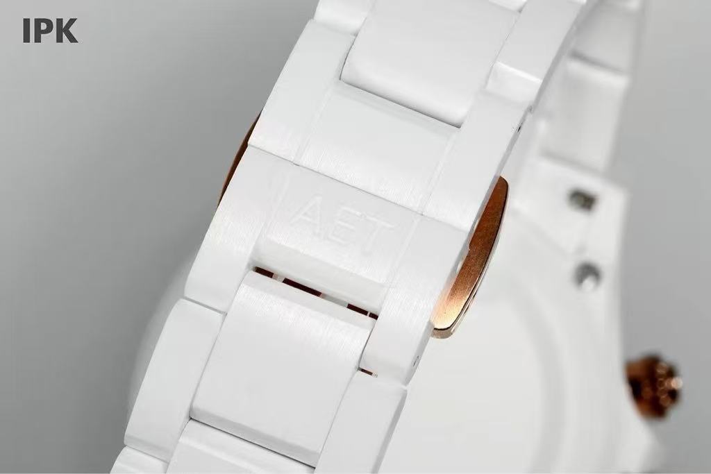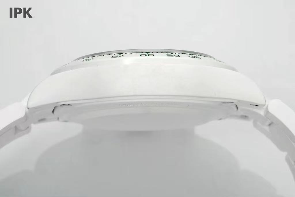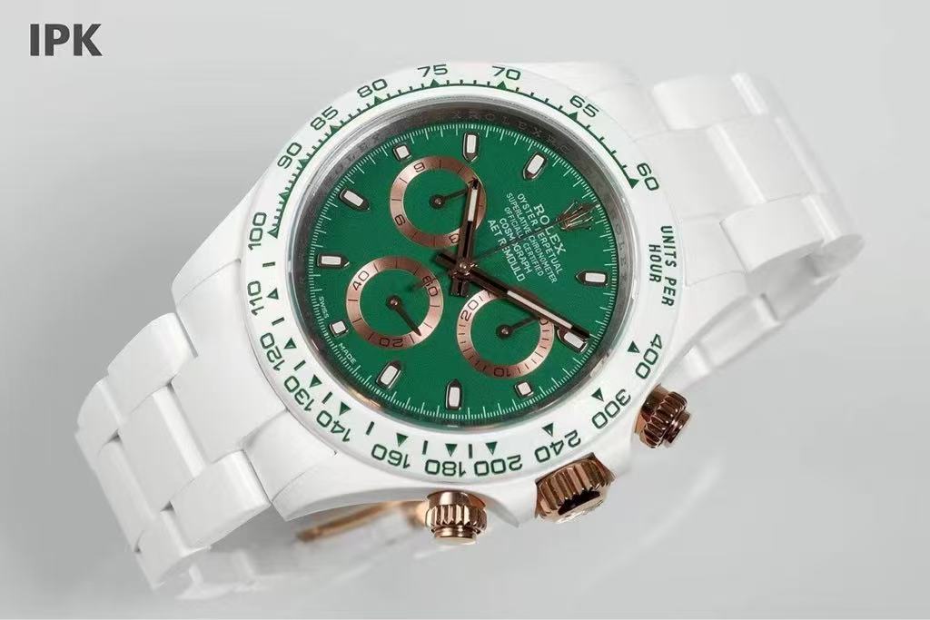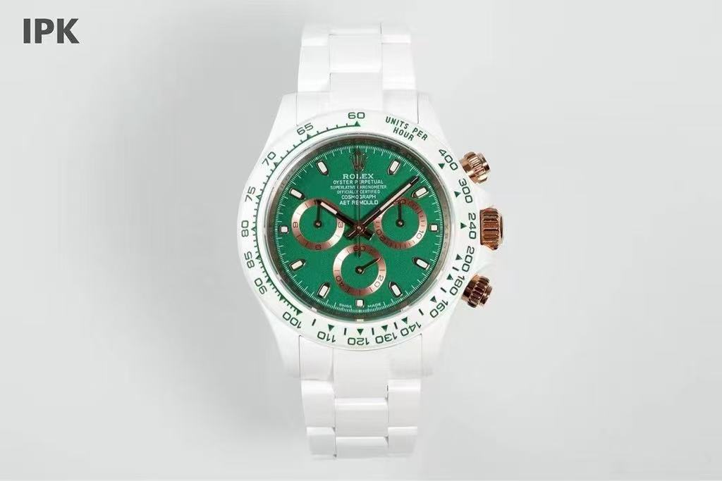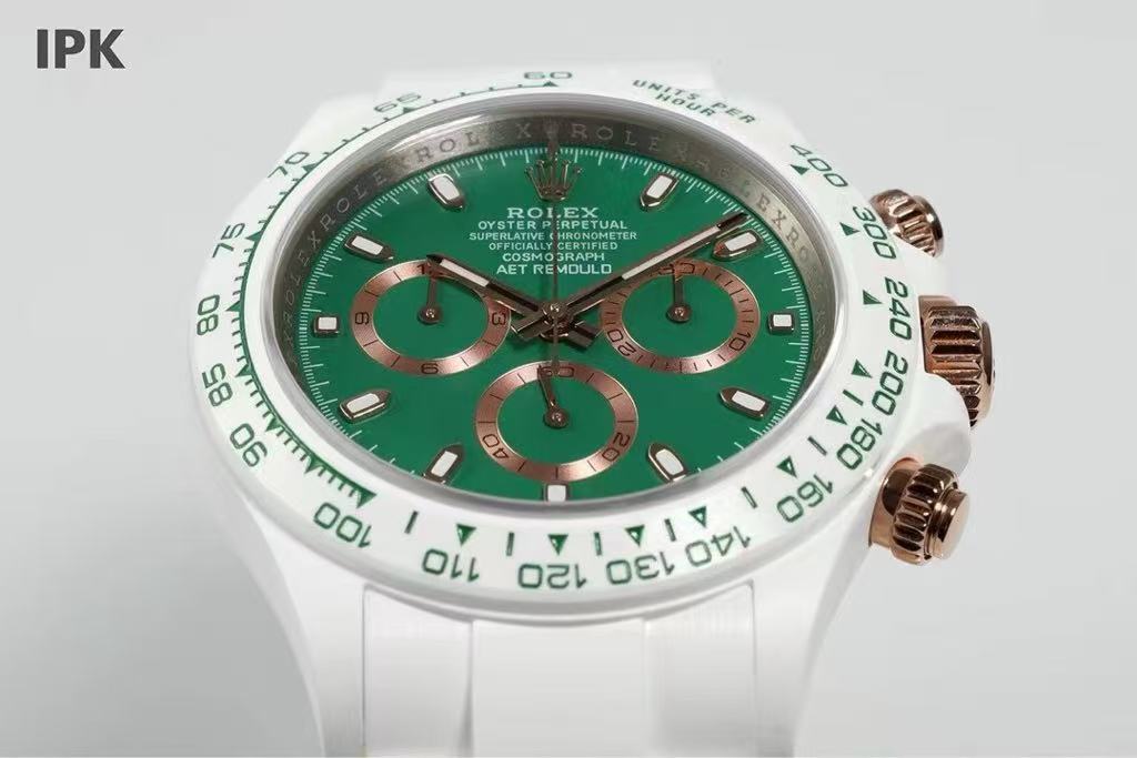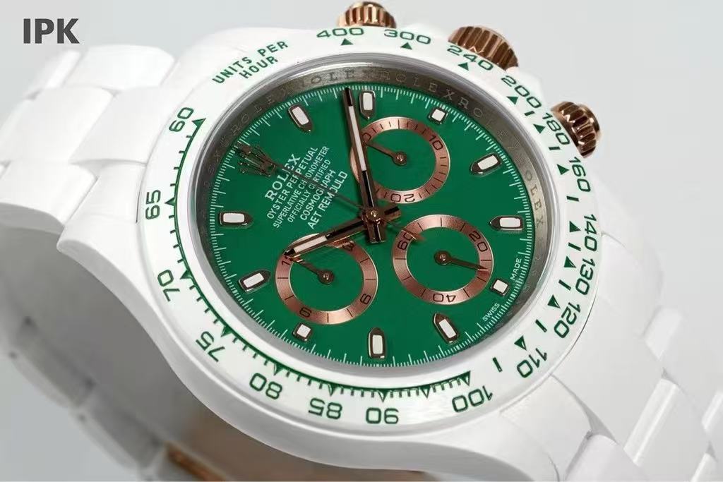 Luxury White Ceramic Daytona-Style Watch – Green Dial, Chronograph Function, Rose Gold Accents, Ceramic Bracelet