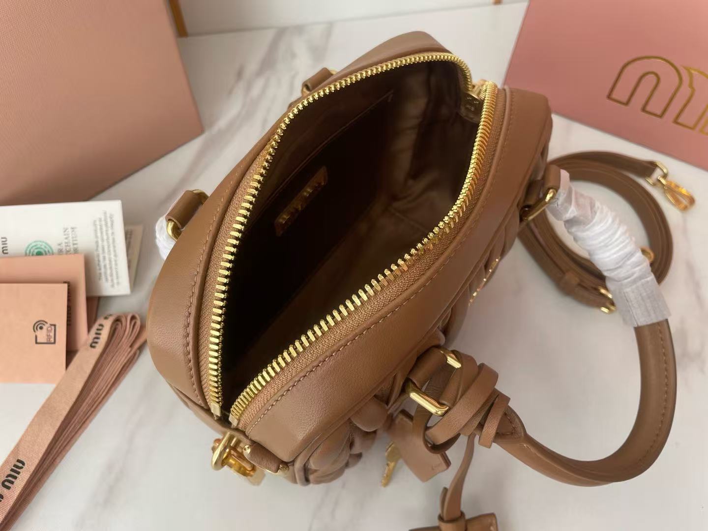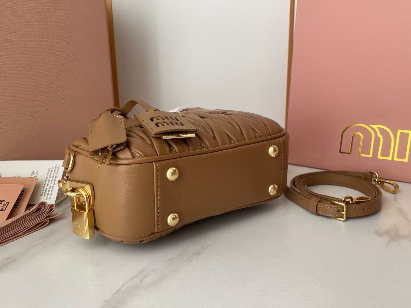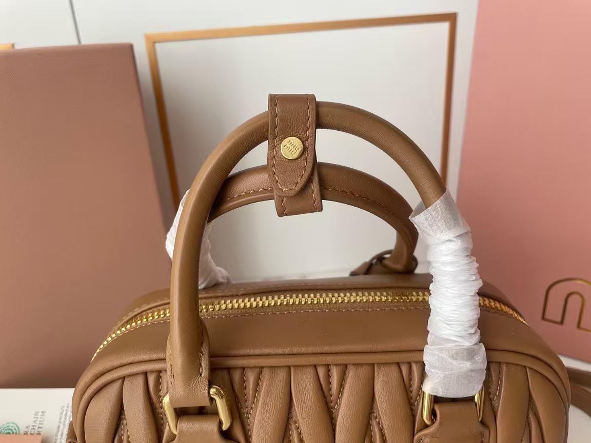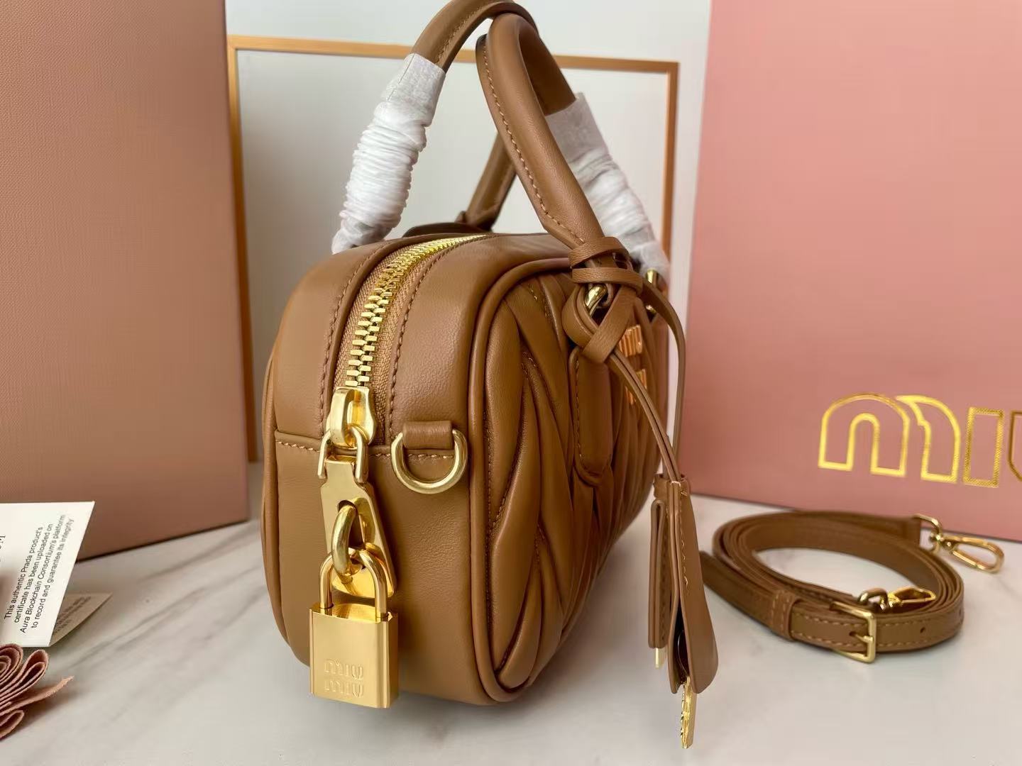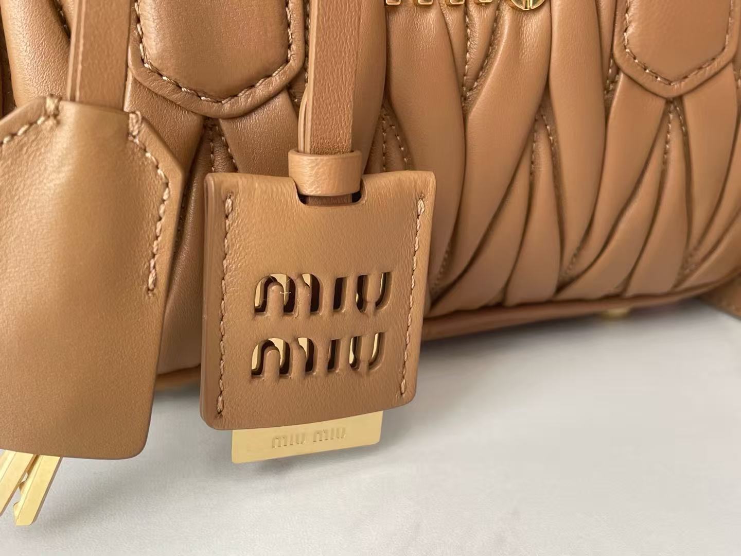 The embossed or metallic “miu miu” logo on the front is more than just branding — it’s a playful nod to fashion heritage, adding a touch of whimsy and identity to every look. With its rounded silhouette and soft drape, the bag offers both comfort and style — perfect for day-to-night transitions.