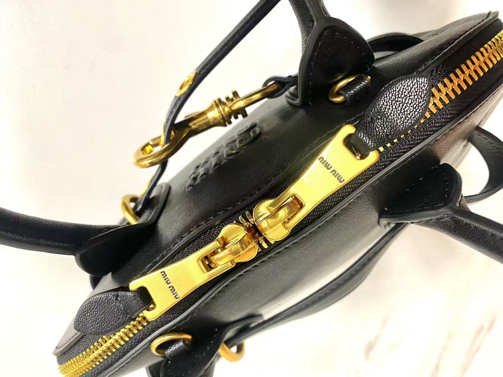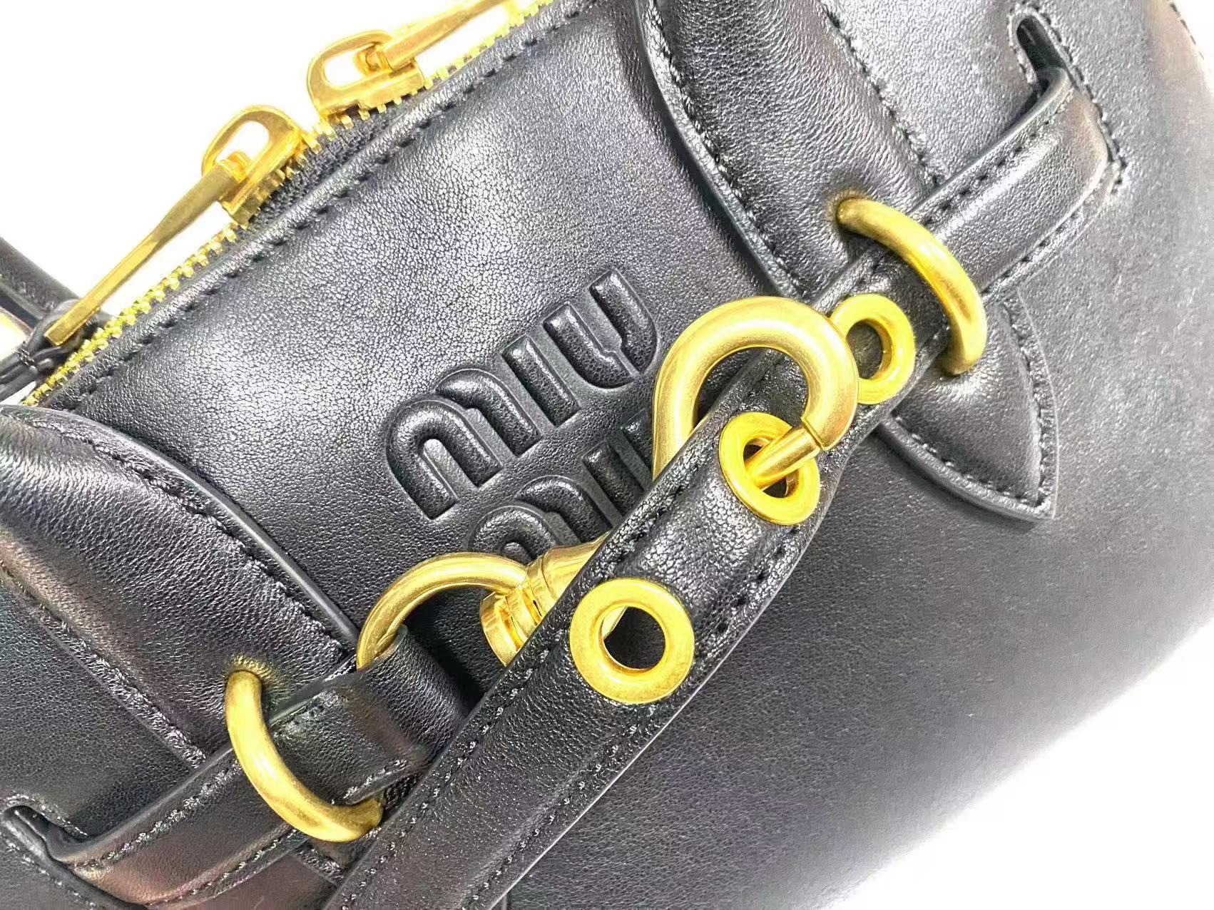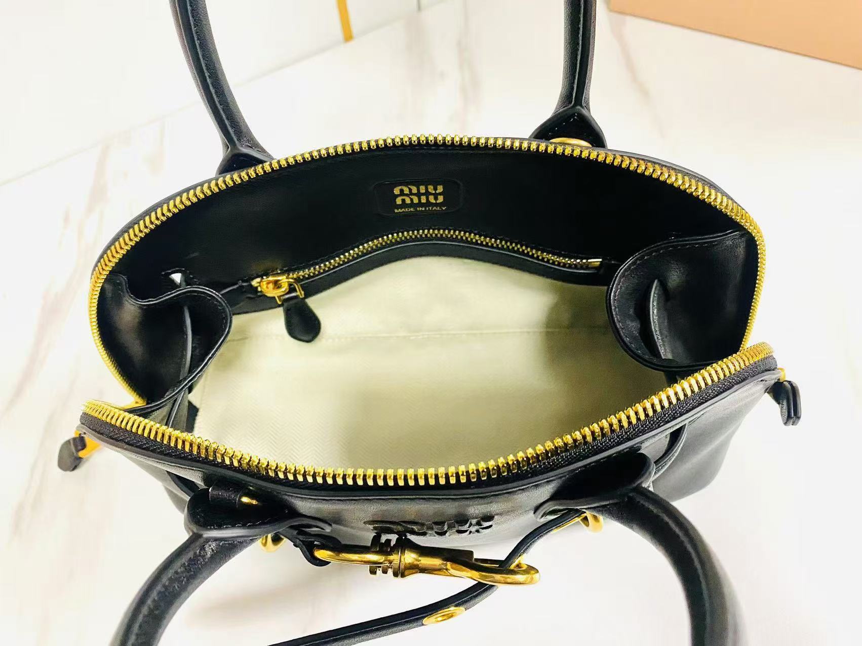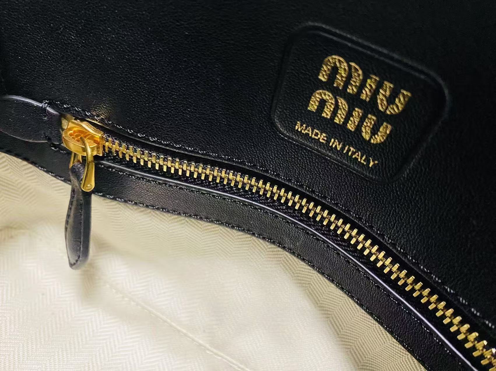 The iconic circular ring handle is more than just a detail — it’s a statement piece that adds drama and sophistication to every look. With its embroidered “miu miu” logo on the front, the bag showcases a subtle yet powerful brand identity, enhanced by precise stitching and clean lines.