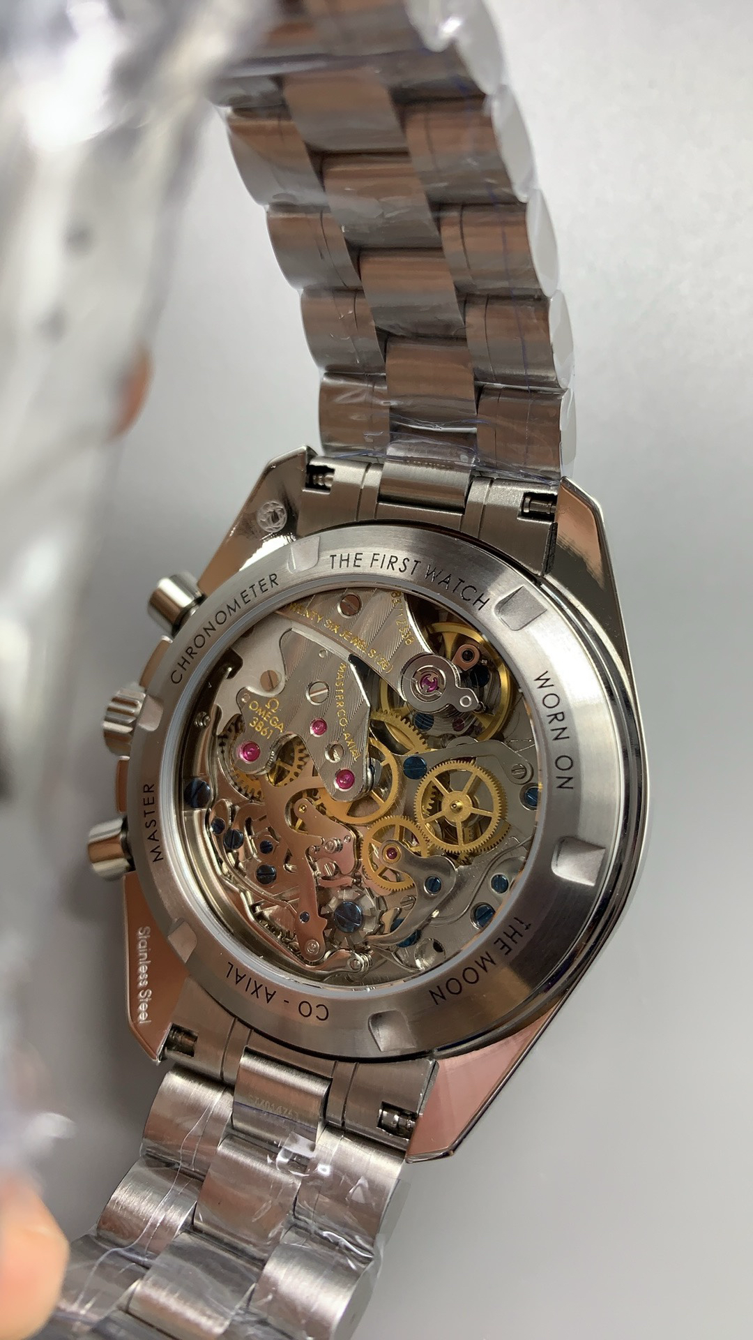 Black Sunburst Dial: The elegant black dial features a subtle sunburst finish with luminous hour markers and hands for excellent visibility in low-light conditions. The three subdials offer a clean, balanced layout typical of the original “Moonwatch” design.