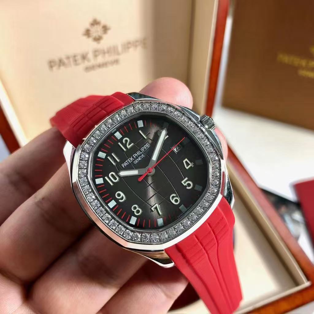Patek Philippe, Aquanaut, women’s watch, black dial, diamond bezel, red rubber strap, automatic movement, Swiss-made, luxury sport watch, UVS Factory