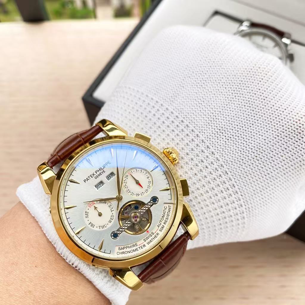 Elevate your wristwear with the Patek Philippe Complications, a masterpiece of Swiss engineering and refined luxury. This men’s timepiece features a radiant white dial with a sunburst finish that glows under light, creating a dynamic interplay of elegance and depth. The dial is meticulously designed with multiple complications: a chronograph subdial at 3 o’clock, a day-of-the-week display at 9 o’clock, and a date window at 12 o’clock—offering both functionality and sophistication.