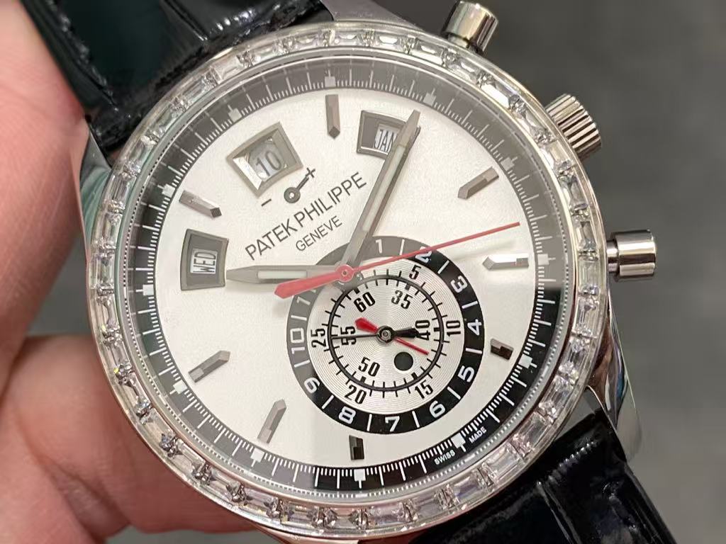 Patek Philippe Complications – Men’s White Dial with Diamond Bezel, Chronograph Function, and Black Alligator Strap