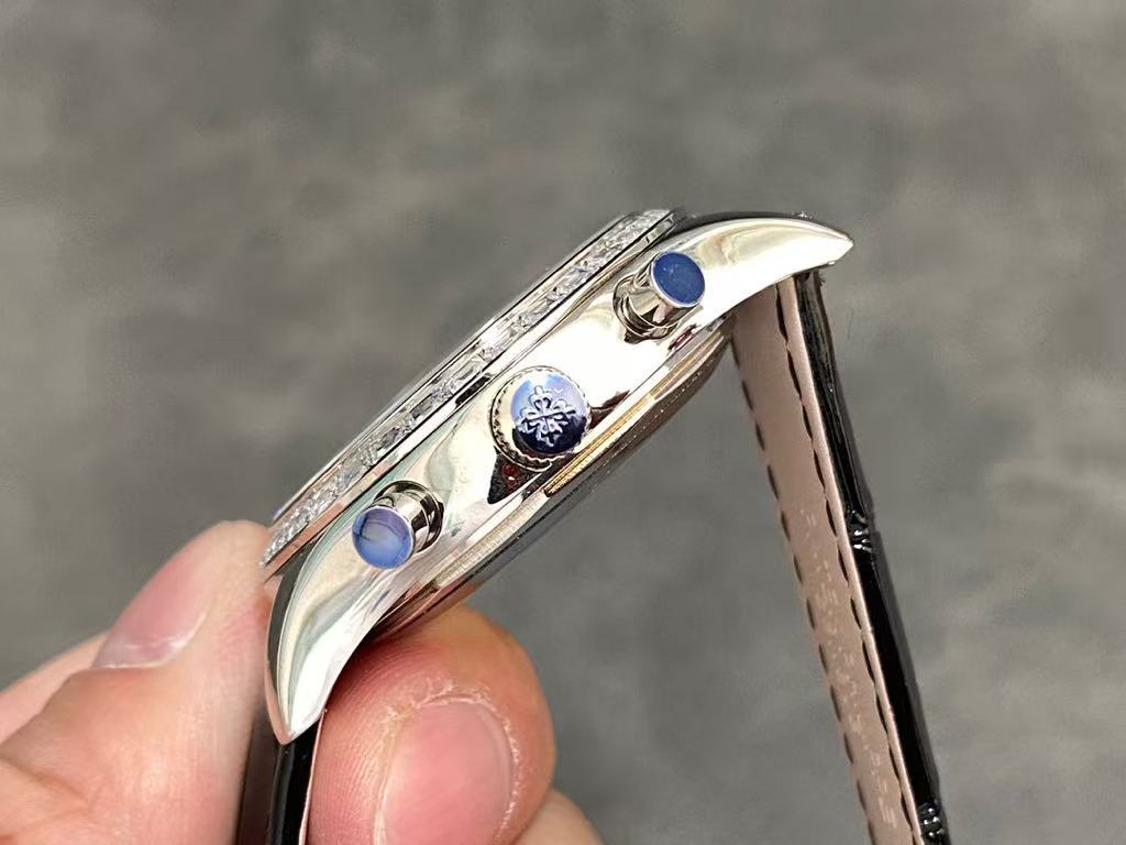 The watch is distinguished by its dazzling bezel set with baguette-cut diamonds that sparkle brilliantly, enhancing its opulent presence. Housed in a polished white gold case with a fluted crown and precise finishing, this timepiece reflects Patek Philippe’s legacy of excellence and timeless craftsmanship.
