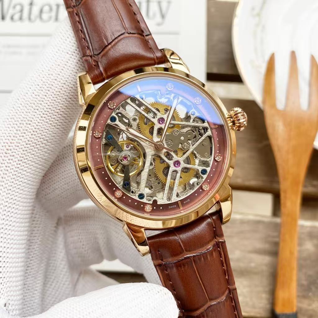Each model is adorned with Roman numeral hour markers and slender hands for refined readability, while the openwork face allows light to play across the intricate mechanics, creating a dynamic visual experience. The watches are complemented by premium alligator leather straps in black and brown, featuring fine stitching and secure folding clasps for comfort and durability.