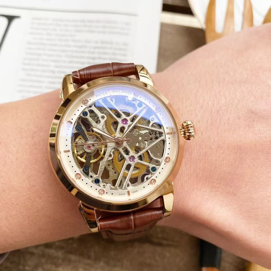 Elevate your style with the Patek Philippe Skeleton Collection, a stunning trio of luxury timepieces that showcase the artistry and precision of Swiss horology. This elegant set features three distinct variations—gold-tone, rose gold-tone, and stainless steel cases—each paired with a transparent dial that reveals the intricately finished mechanical movement beneath. The skeletonized design highlights hand-engraved bridges, polished gears, and a beautifully decorated oscillating weight, offering a mesmerizing glimpse into the craftsmanship of each watch.