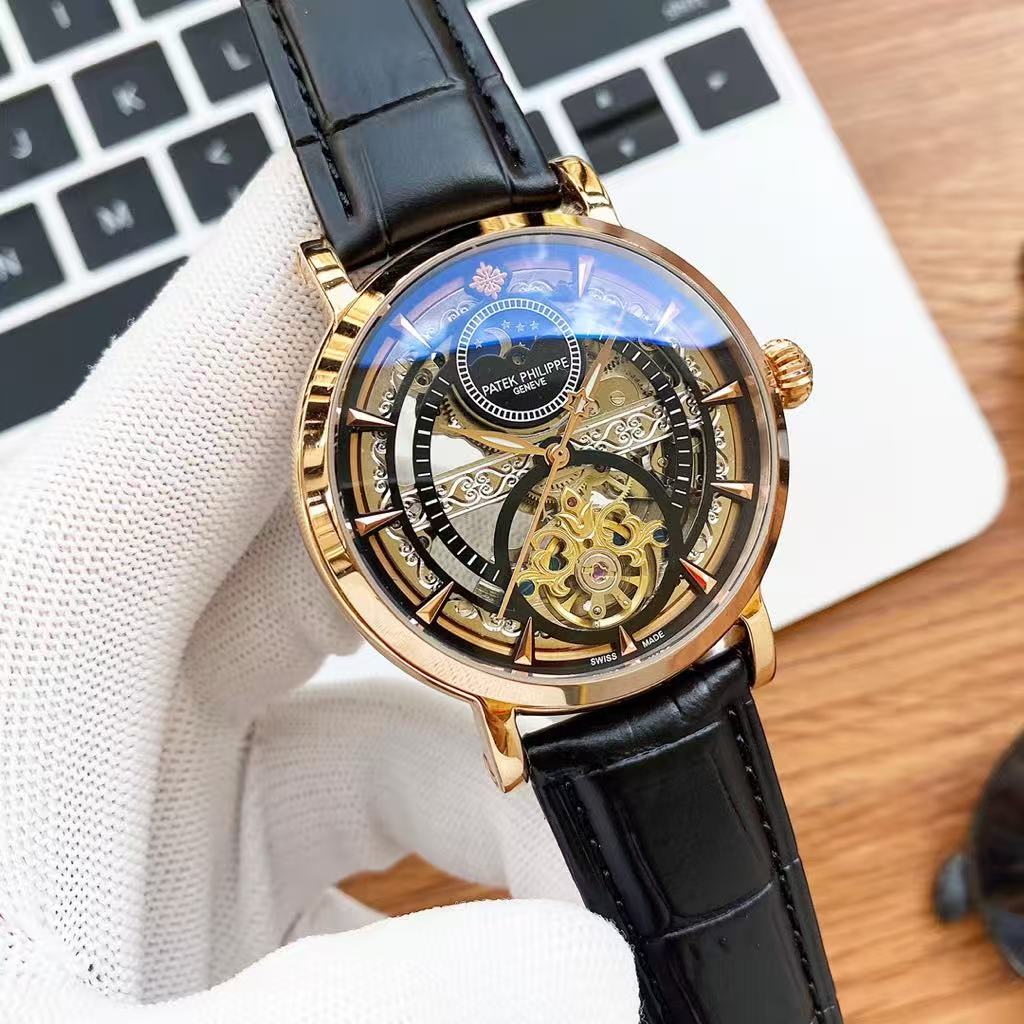 Discover the mesmerizing art of mechanical craftsmanship with the Patek Philippe Skeleton, a stunning timepiece that blends Swiss precision with elegant design. This men’s watch features a fully transparent dial, revealing the intricate inner workings of its finely finished automatic movement. The skeletonized structure showcases beautifully engraved bridges, polished gears, and a golden-toned oscillating weight adorned with an ornate floral motif—highlighting the artistry behind every detail.