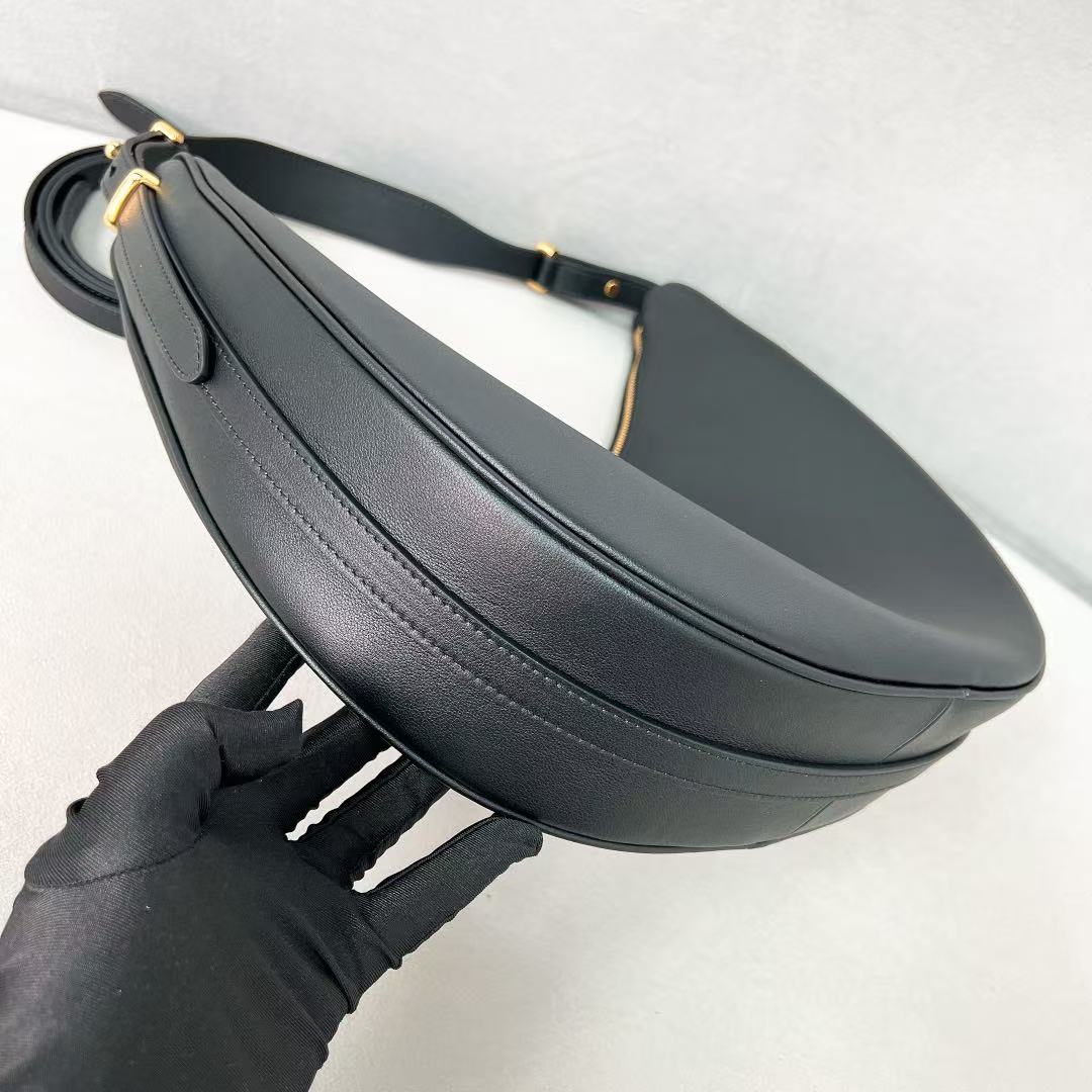 Prada-Style Black Calf Leather Crossbody Bag – Embossed Triangular Logo with Buckle Strap