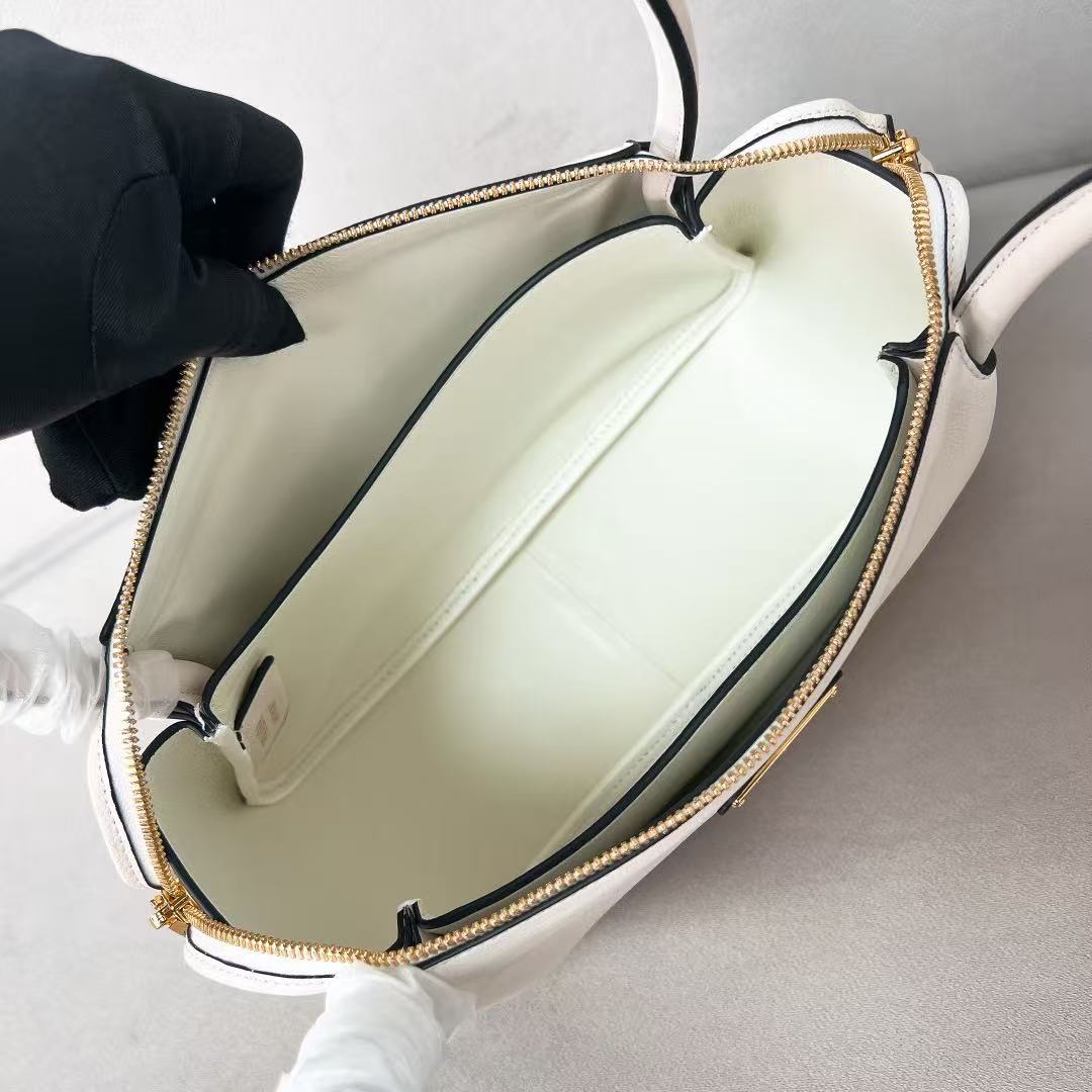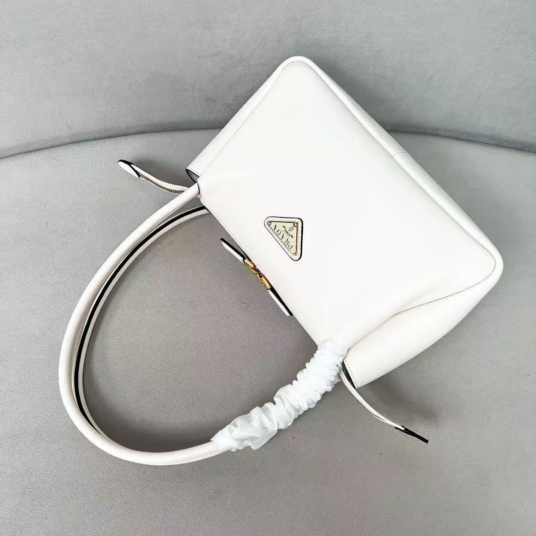 Prada-Style White Leather Top-Handle Bag – Minimalist Design with Gold-Tone Triangular Logo