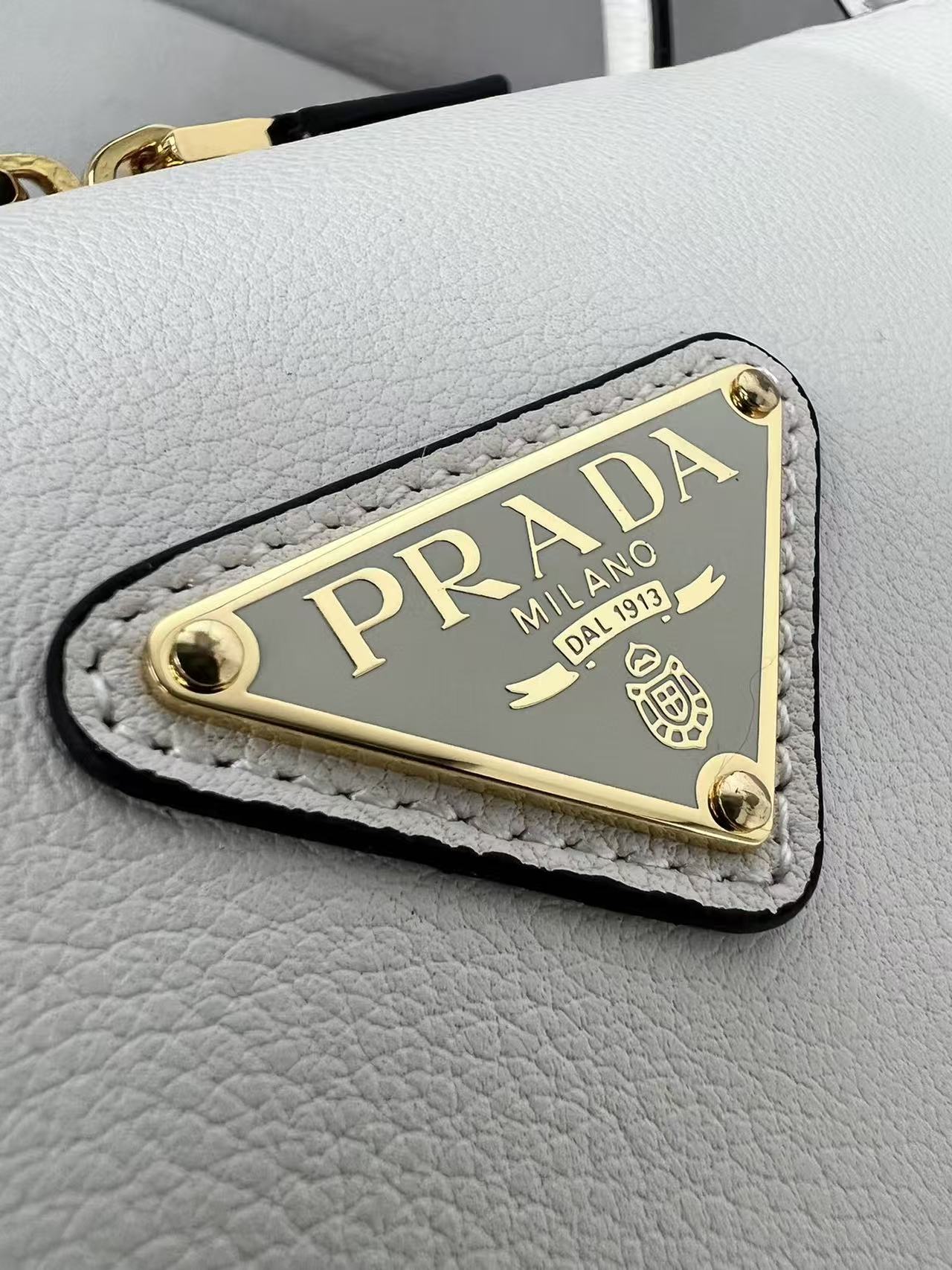 ✔️ Gold-tone triangular logo plaque – “PRADA MILANO” engraved with timeless sophistication