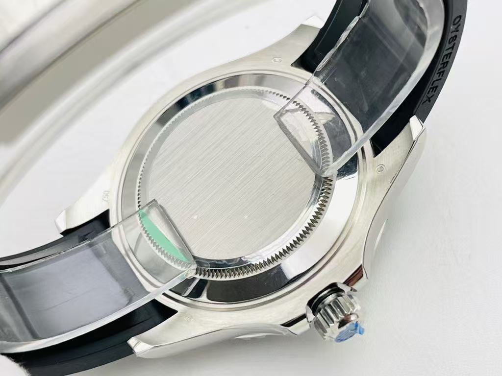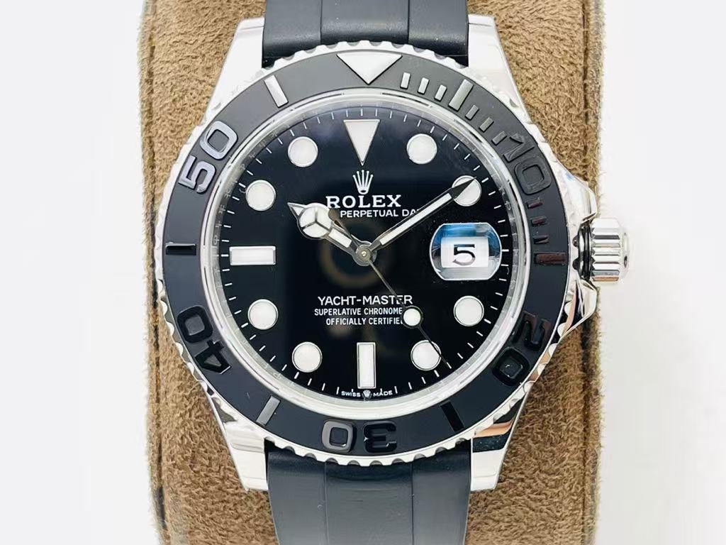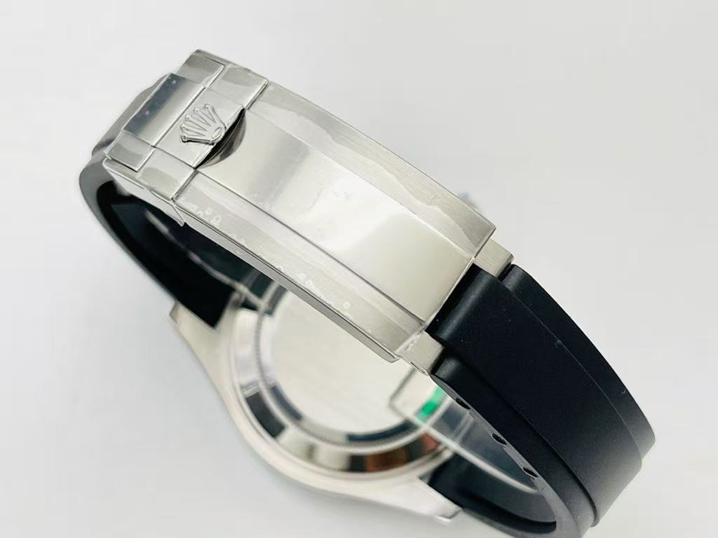 Housed in a robust stainless steel case, this Yacht-Master replica offers water resistance up to 100 meters (330 ft), making it ideal for marine activities and everyday wear. Paired with a comfortable black rubber strap, it delivers both durability and a modern, sporty look.
