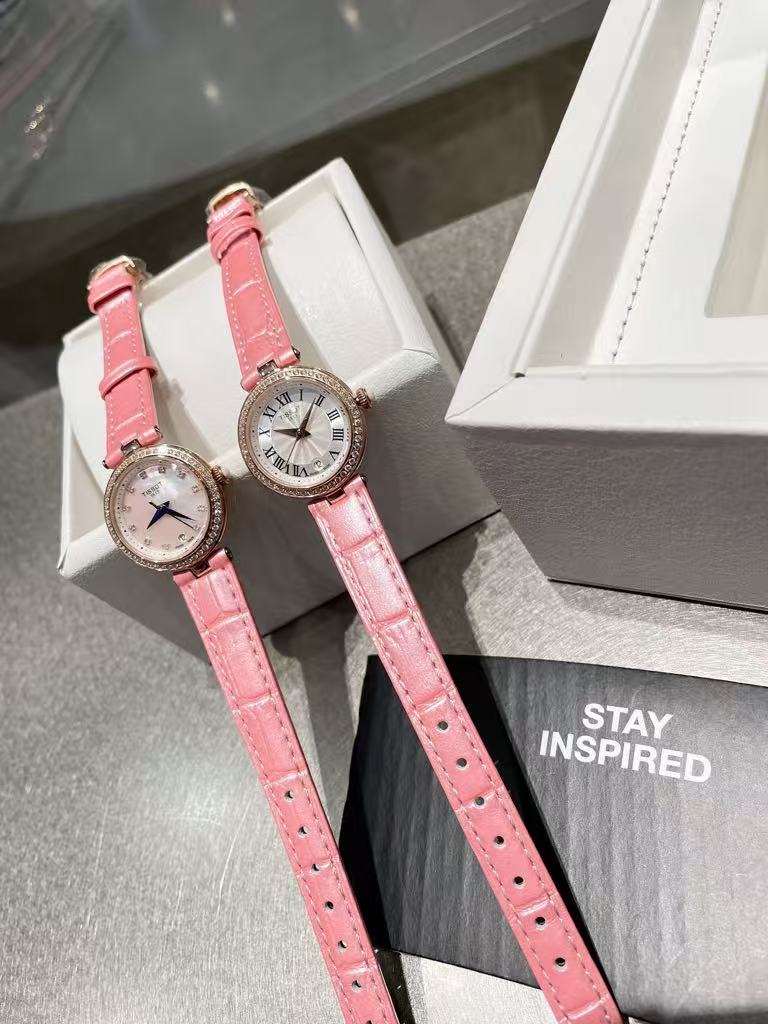 Both versions feature Roman numerals at 12, 3, 6, and 9 o’clock, along with sleek baton markers and slim hands for excellent readability. The pink alligator-style leather strap is soft, lightweight, and comfortable for all-day wear — perfect for pairing with dresses, blouses, or casual outfits.