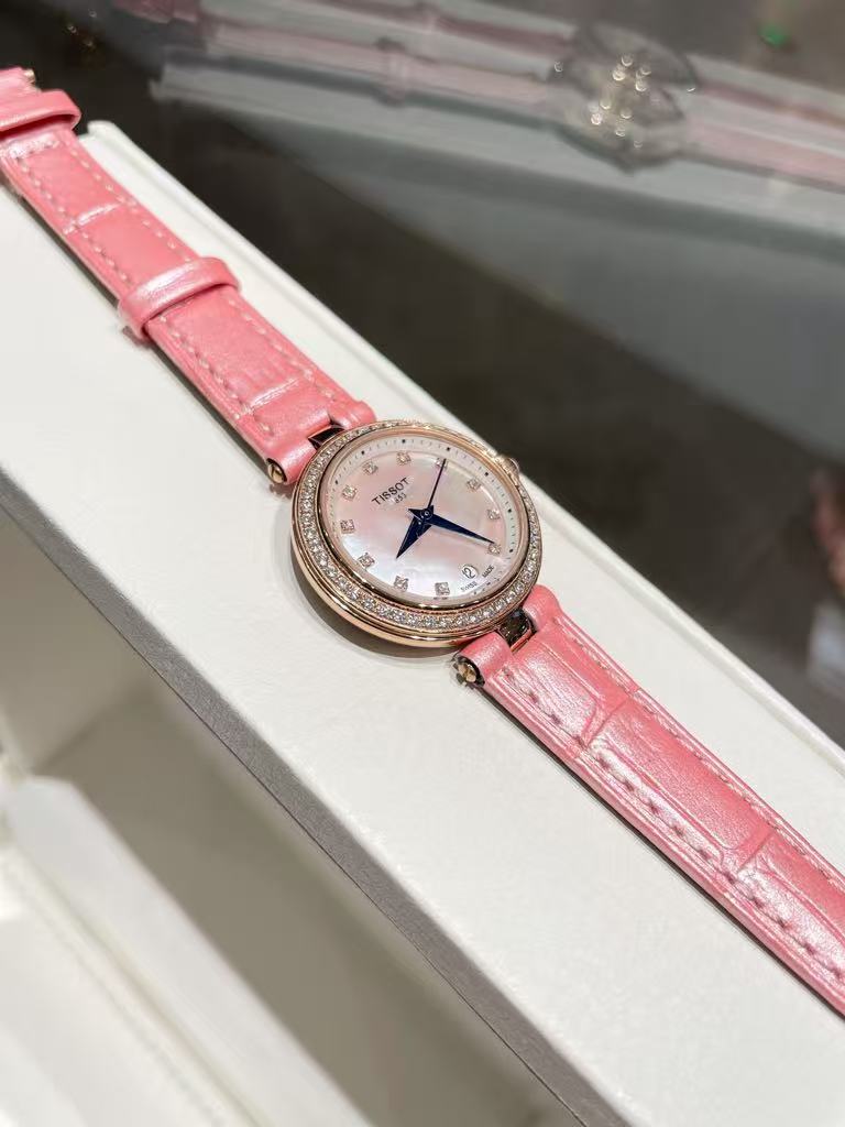 Tissot Lady’s Watch – Pink Leather Strap, Crystal-Encrusted Bezel, Mother-of-Pearl & White Dial Options