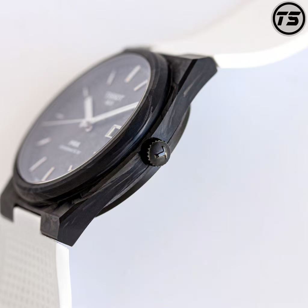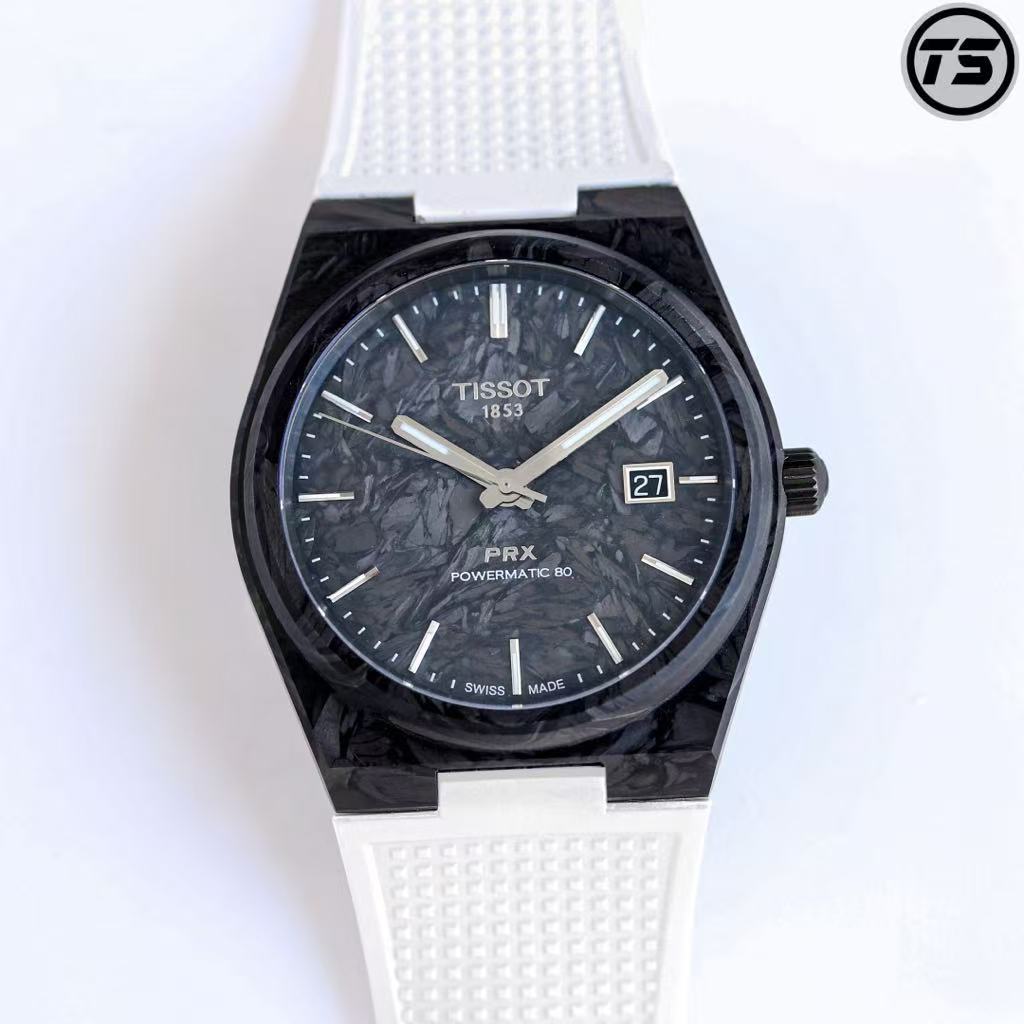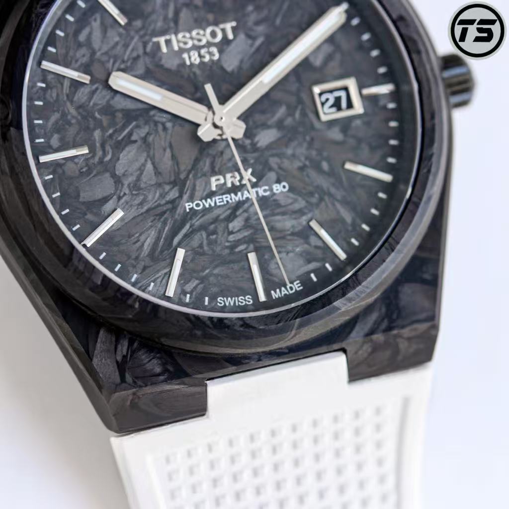 Tissot PRX Powermatic 80 Watch – Carbon Fiber Texture Case, White Rubber Strap, Swiss Made Automatic