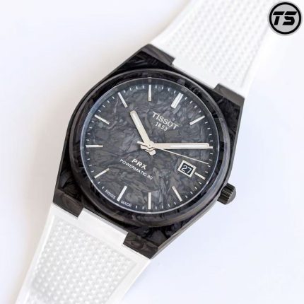 Tissot PRX Powermatic 80 Watch – Carbon Fiber Texture Case, White Rubber Strap, Swiss Made Automatic
